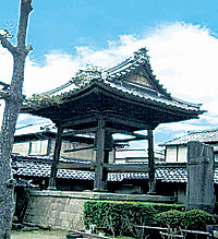 ・御殿と山門及び太鼓楼や長屋門:これらは本堂に引き続き再建されたよう であり、山門から見つかった上棟札からは、弘化3年(1846)の年号 が見られます。本堂の屋根が御殿の屋根に重なっていますが、新しい本堂が以前より大きくなったためと思われます。なお、庫裏は大正年間に初代住職芳滝智導師入山に際し、自坊の善龍寺の門徒が山から木を切り出しここに運びそれで再建されました。芳滝智導 師は、村上家絶家に伴い本山要職を経て難宗寺住職として入寺されました。